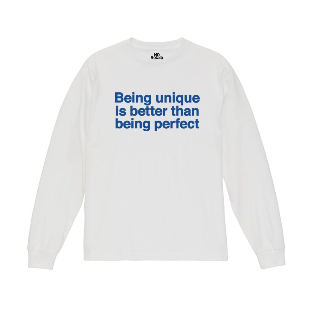 ・「ユニークであることは完璧であることよりも優れている」といった意味合いのあるメッセージのロゴをプリント