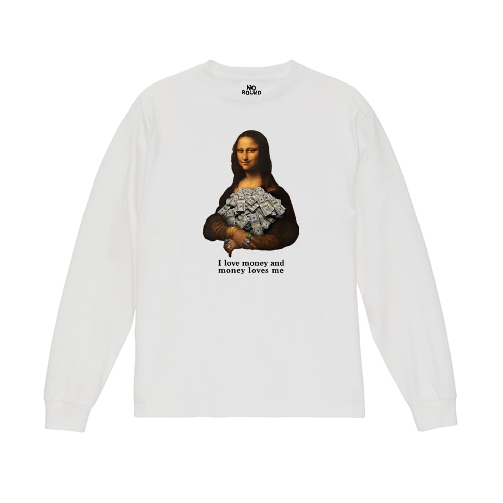 ・「私はお金が大好き、そしてお金も私を愛している」といった意味合いのあるメッセージロゴと、モナリザのパロディプリント
