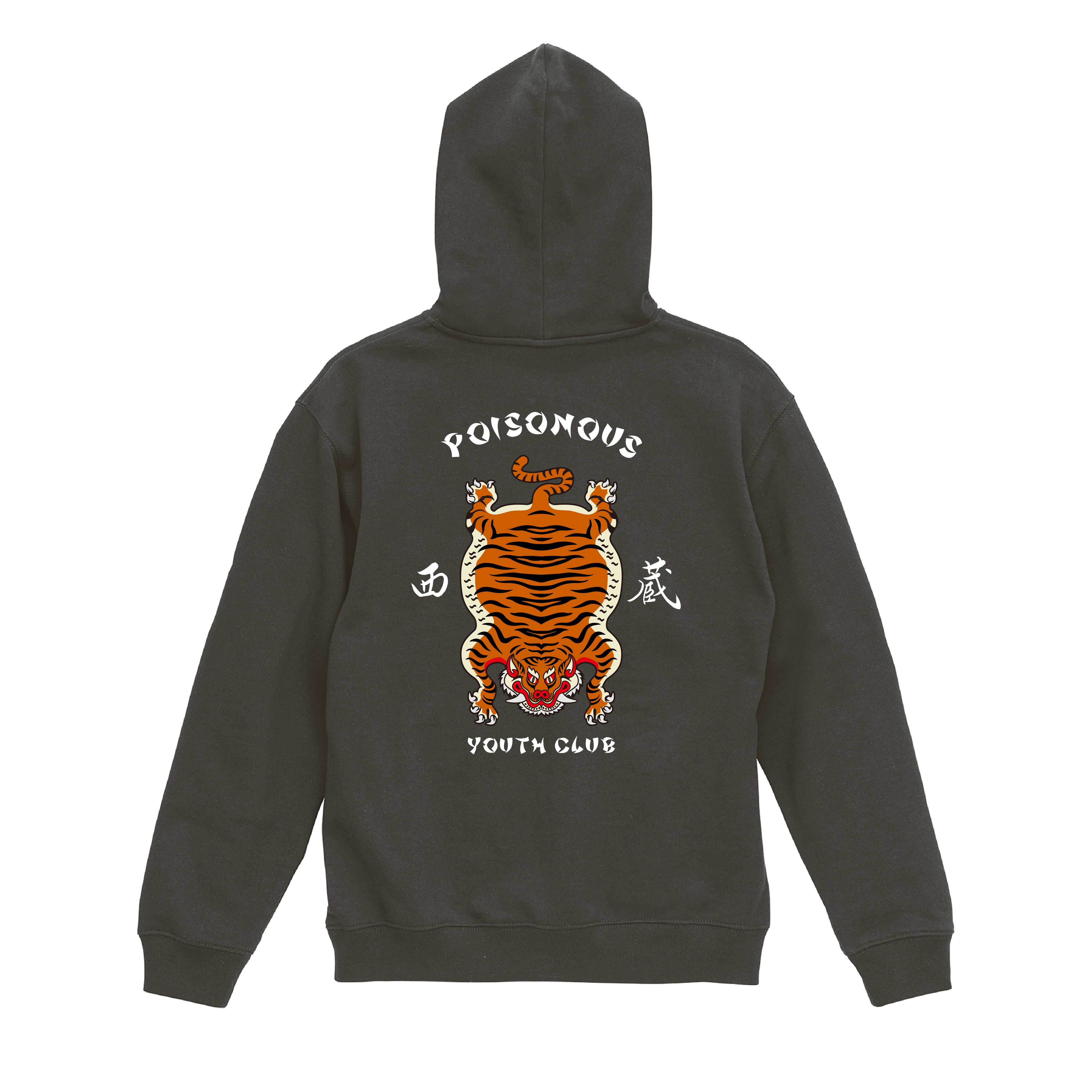 チベタンタイガー バックプリント 裏パイル フルジップパーカー。