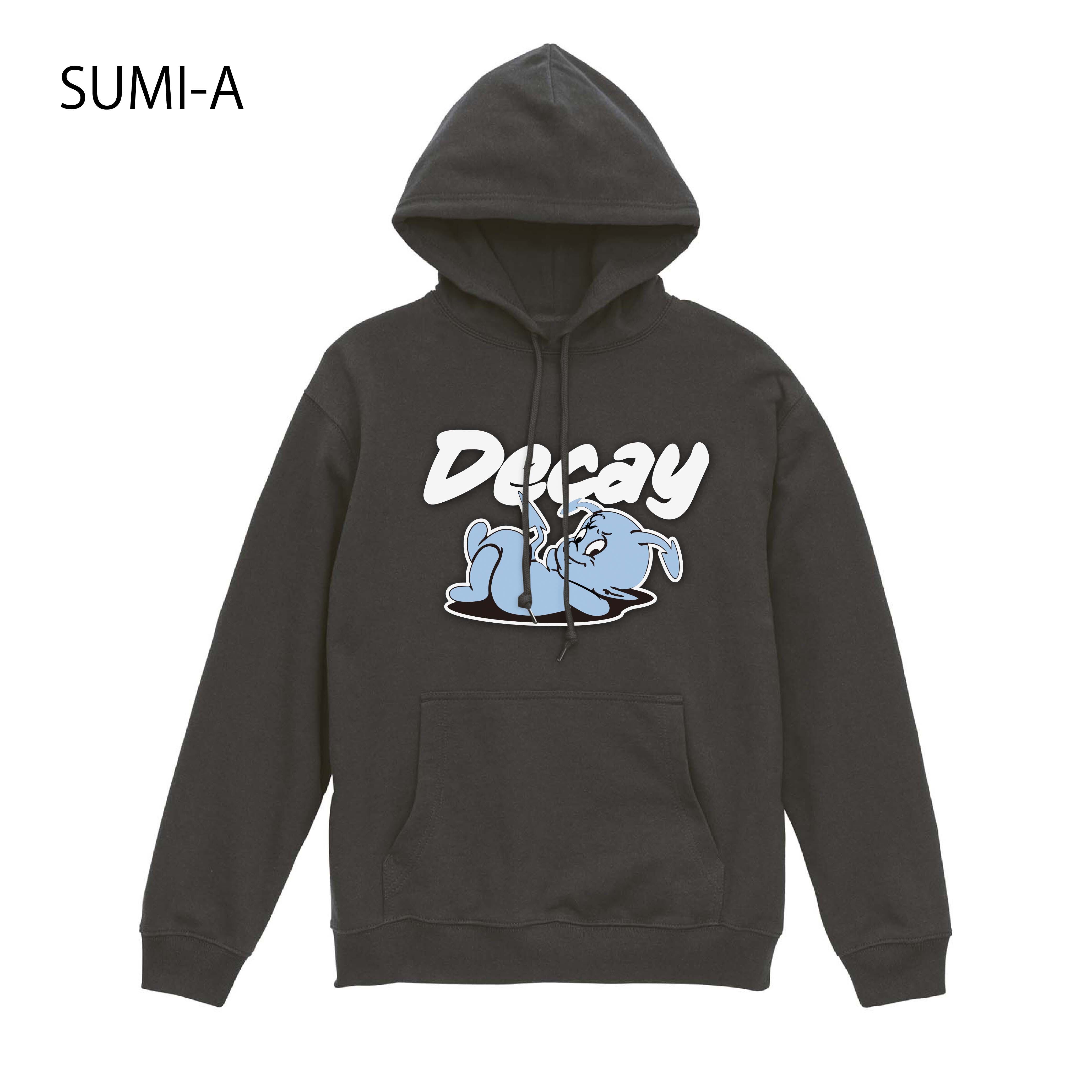 ・「減衰」などの意味のロゴと、怠惰なデビルイラストが映えるプリントデザインのスエットパーカー