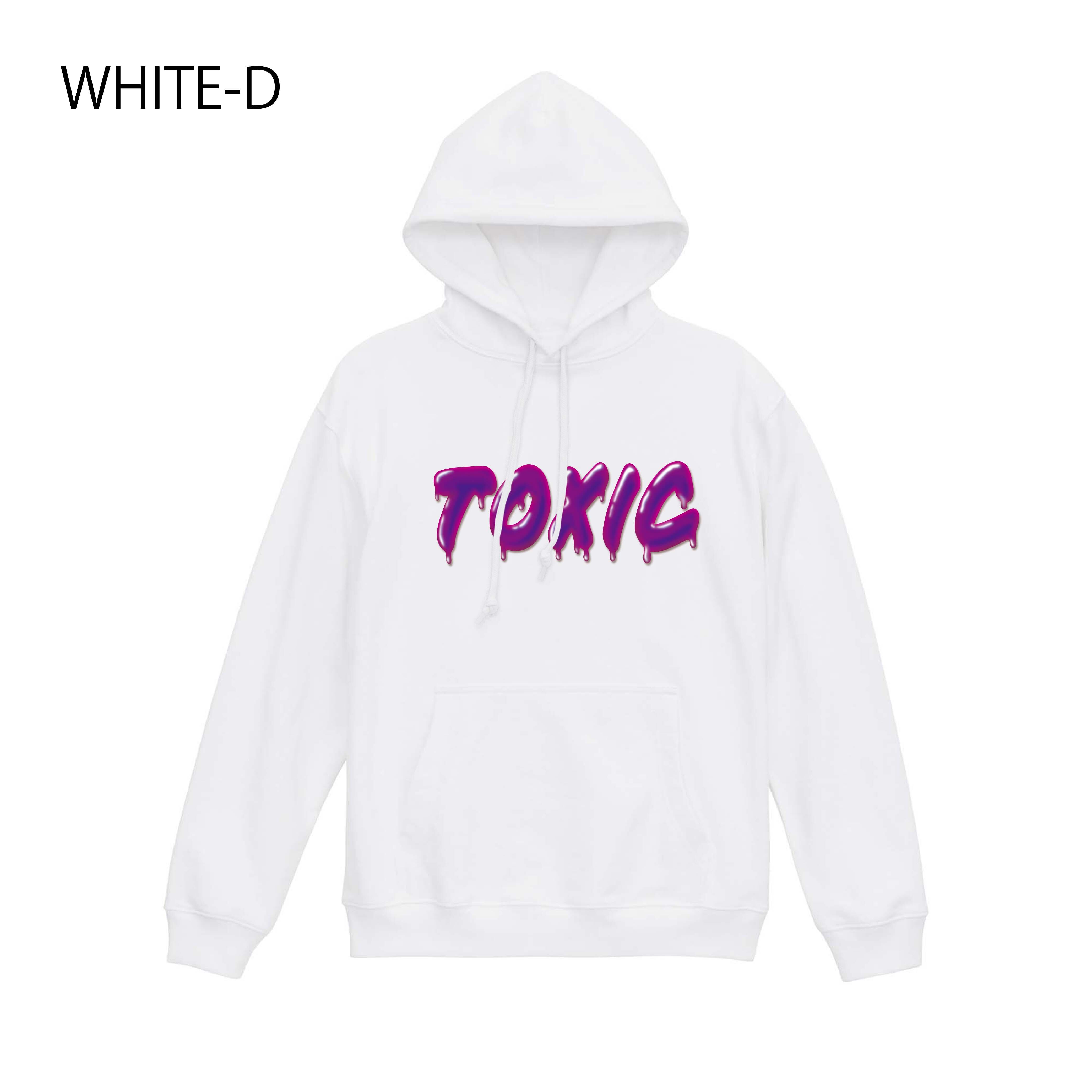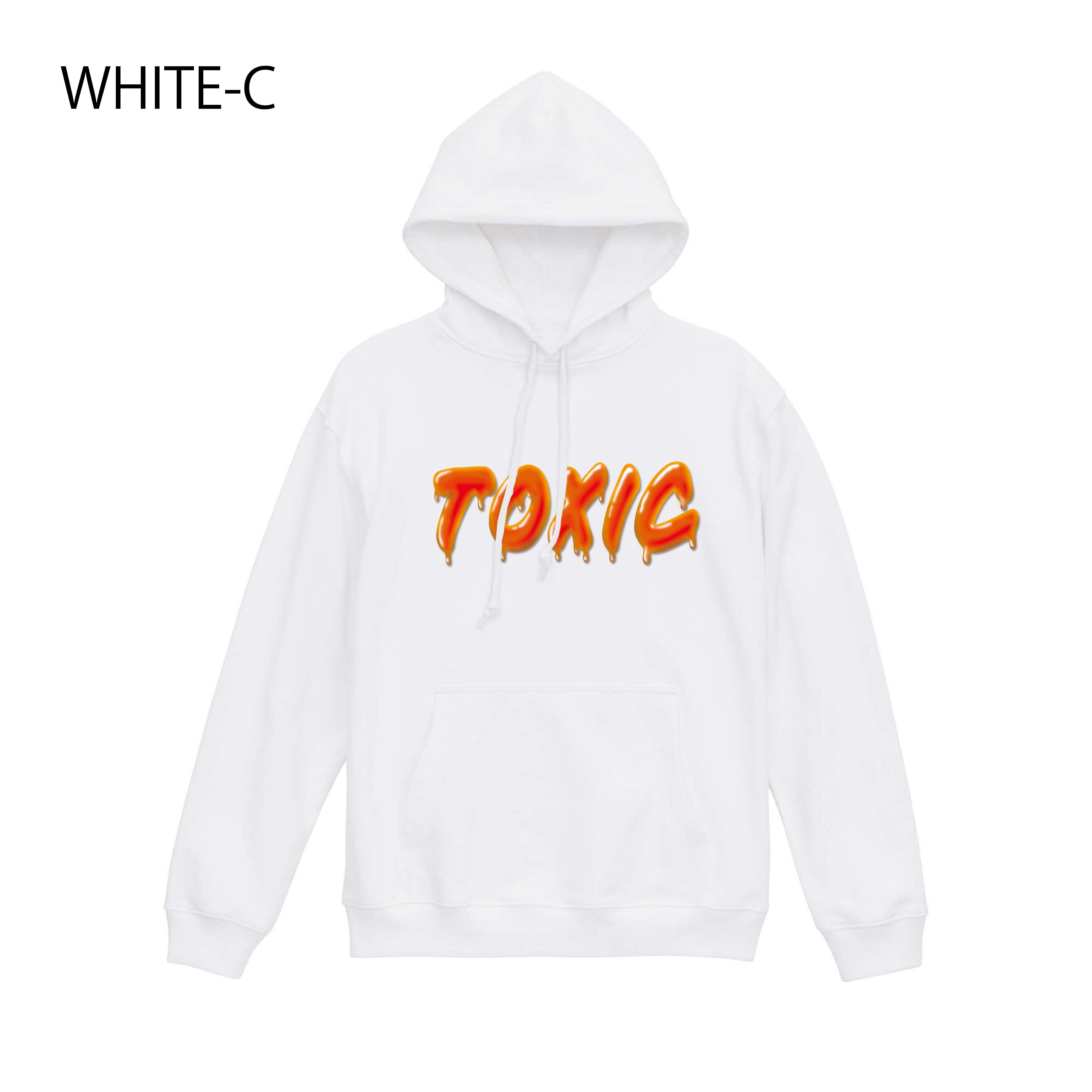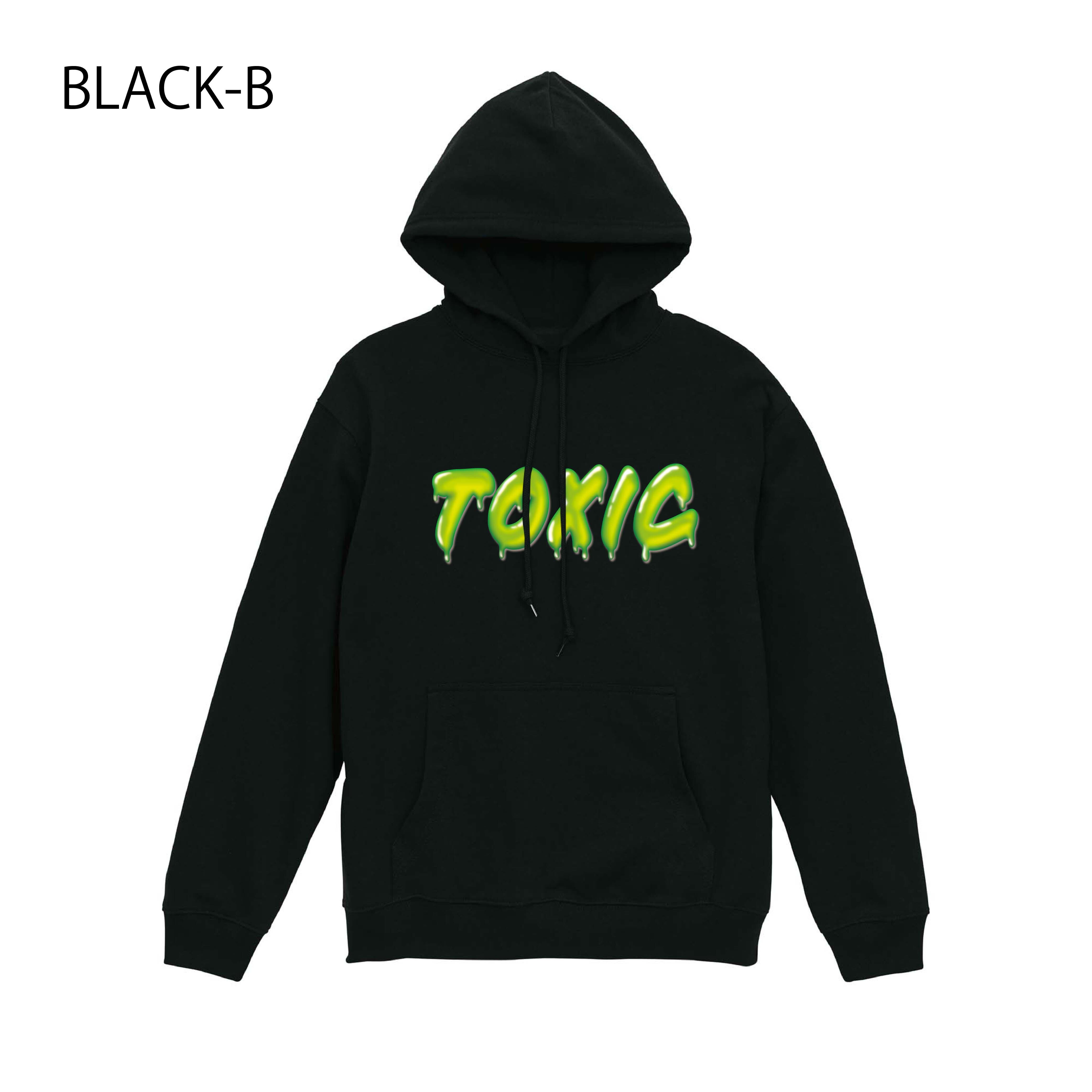 ・「TOXIC」とマッチした毒々しいカラーリングのロゴが映えるプリントデザインのスエットパーカー