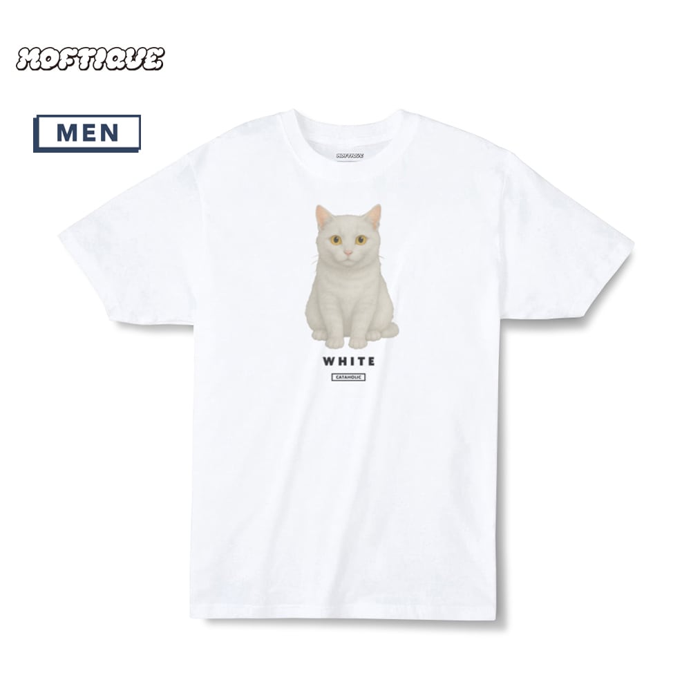 Moftique(モフティック) エントリーモデル 半袖Tシャツ アニマル 白猫 キャット ペット インクジェットプリント 褪せ感 4.0オンス 薄手 トップス カットソー 夏 カジュアル メンズ レディース ユニセックス