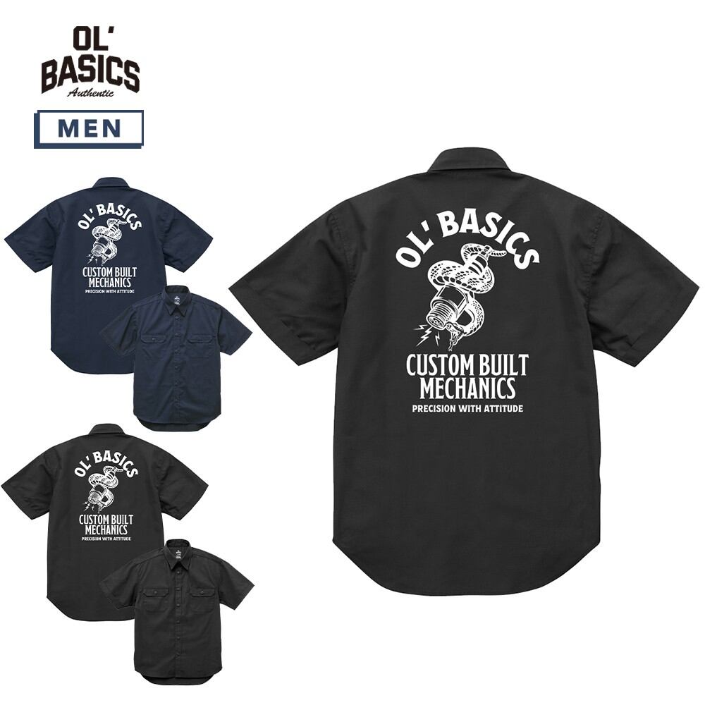 Ol' Basics(オール・ベーシックス) ワークシャツ メンズ レディース ユニセックス 半袖 スパークプラグ 蛇 スネーク イラスト ロゴ バックプリント カジュアルシャツ 半袖シャツ トップス ワーク ミリタリー アメカジ カジュアル