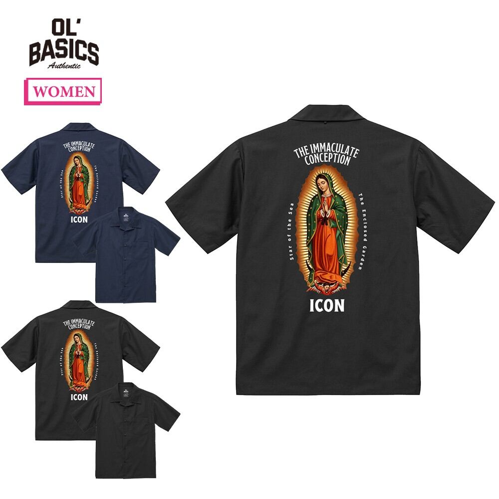 Ol' Basics(オール・ベーシックス) オープンカラーシャツ レディース ユニセックス 半袖 グアダルーペの聖母 マリア イラスト バックプリント カジュアルシャツ 半袖シャツ 開襟シャツ トップス ワーク アメカジ カジュアル